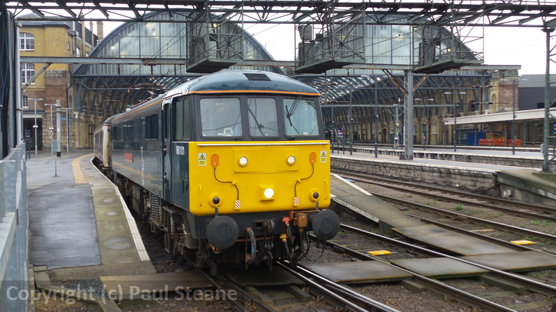 Electric Traction Ltd.'s electric locomotive 86101 is in No.1 Loco Holding Siding at London King's Cross, while shunting onto the empty stock of the Highland Caledonian Sleeper in platform 1. The diversion of Caledonian Sleeper services over the East Coast Main Line, away from the normal routing via the West Coast Main Line, was due to engineering works relating to the re-modelling at Norton Bridge.