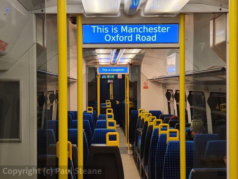 Northern EMU 323 232 has arrived in the "wrong" platform at St Helens Junction station after using the facing crossover at Sankey Jn (just west of Earlestown station) and running "wrong line" to here. Pilotman working was in force for this move, the pilotman being picked up and dropped off at Earlestown station. Special working instructions and the presence of the Pilotman authorised this unusual manoeuvre. Amongst other reasons, use of this platform ensured that passengers using the rail replacement bus did not have to use the station footbridge, from where this photograph was taken.