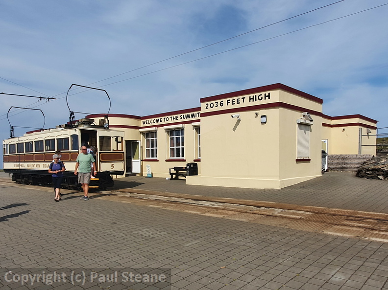 Snaefell Mountain Railway cars 2 and 5 at Laxey. No.5 will form the 10:15 departure to Snaefell summit, No.2 a later departure. Both date from the line's opening in 1895.
