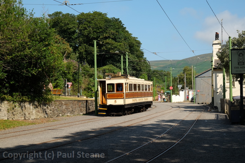 The busy interchange at Laxey. Manx Electric Railway car 22 with trailer 44 is working the 09:40 from Derby Castle (Douglas) to Ramsey, and far right is Snaefell Mountain Railway car 4 in green/white livery; both will work their respective 10:15 departures from Laxey. Also on the right, Snaefell Mountain Railway car 2 in red/white livery will work a later departure. Various tour `groups` are milling around in front of the station building, which houses a café, toilets and staff accommodation.