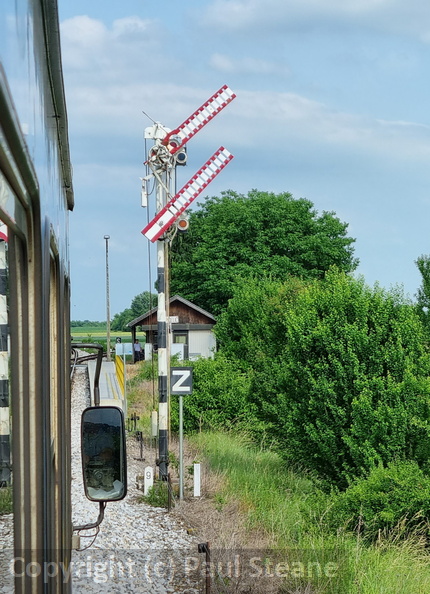 HŽ (Hrvatske Željeznice, Croatian Railways) DMU 7121 105/7121 106 approaches Pčelić, the junction of the line to Daruvar. This line has an extremely sparse service, re-opening in 2018 after closure in 2010. Note the semaphore signals presently showing "stop".