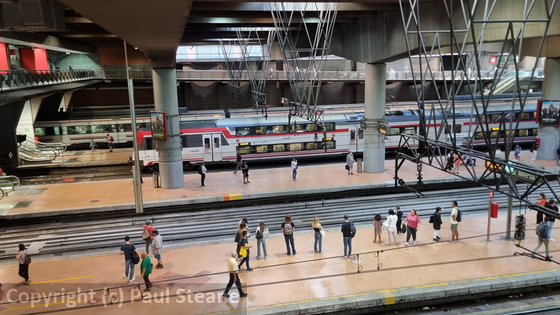 A view over the suburban (Cercanías) platforms at Madrid Atocha, the main station on the south side of Madrid. All these tracks are broad gauge and 3000 V dc. As well as the Cercanías services, any broad gauge main line (Medium or Long Distance) trains use this part of the station.