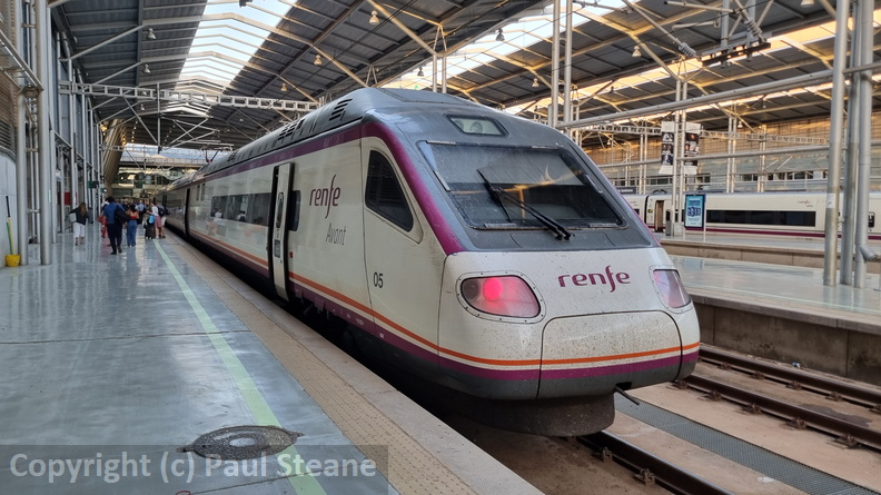 RENFE 'Avant' standard gauge EMU 104005 at Sevilla Santa Justa, ready to work AVANT train 8175, the 17:50 to Málaga María Zambrano via the high speed lines through including a reversal at Córdoba.