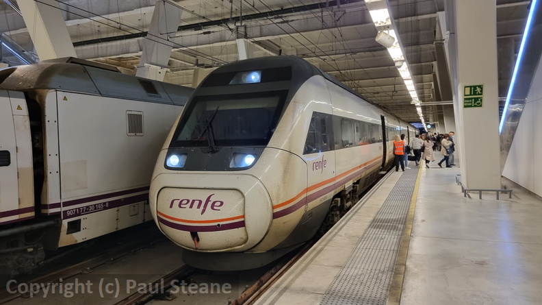 RENFE (Red Nacional de los Ferrocarriles Españoles, Spanish National Railways) class 121 broad gauge EMU 121003 at Santiago de Compostela, working train MD9173 between A Coruña and Vigo Urzáiz. This route is all electrified at 25 kV 50 Hz.
