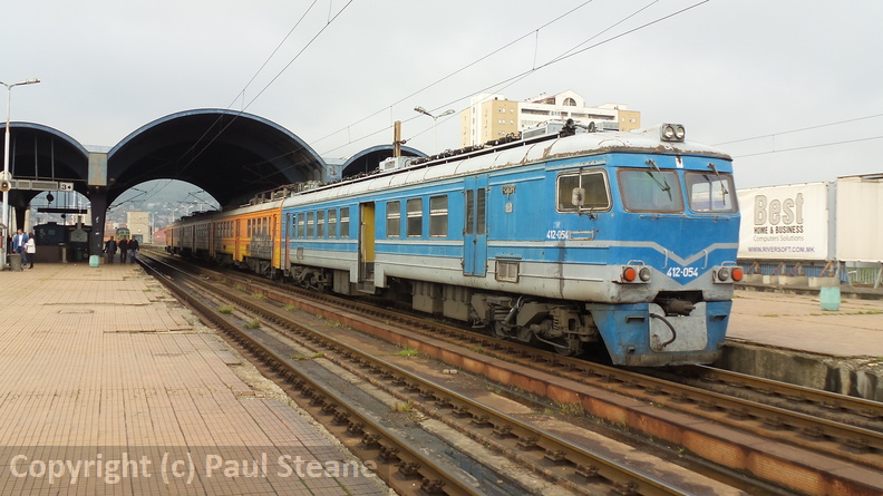 MŽ (Makedonski Železnici, Macedonian Railways) diesel locomotive 661-223 and electric locomotive 441-754 at Skopje. 441-754 would work the 08:20 departure to Niš in Serbia via Kumanovo to Tabanovce; there a Serbian electric locomotive would be attached for the remainder of the run via Preševo to Niš.