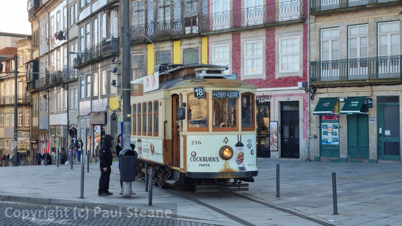 STCP (Sociedade de Transportes Coletivos do Porto) tram 216 at the temporary Clérigos terminus, ready to work the 09:45 departure to Passeio Alegre. Due to construction works for a new metro line, there is no control over the road traffic signals: a police escort is provided for departing trams.